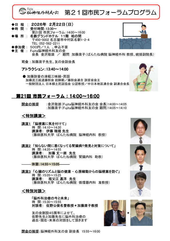 脳神経外科友の会の春のメイン行事 『第20回市民フォーラム』 を2025年5月18日(日)午後に名鉄グランドホテル11階・柏の間にて開催しました。