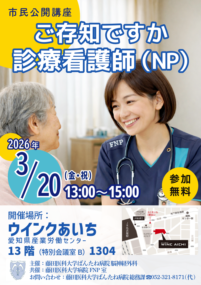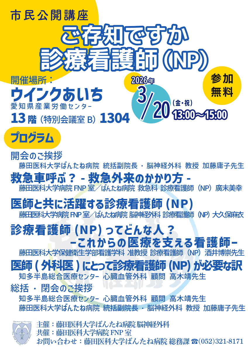 投稿日: 2026年2月18日 投稿者: tomonokai診療看護師に関する市民公開講座のご案内 加藤庸子先生の御指導により、3月20日(祝・金)13時~15時、名古屋駅から徒歩5分のウインクあいちにて、診療看護師に関する市民公開講座を開催させて頂きます。。 診療看護師(NP)は、現在3名が加藤庸子先生とともに、患者様をお待たせしない診療をお届けすべく活動しておりますが、まだ国家資格でない診療看護師に関して、なかなか皆さんに知っていただく機会がございません。 市民公開講座に皆様の参加をお待ちしています。
